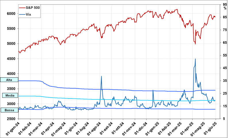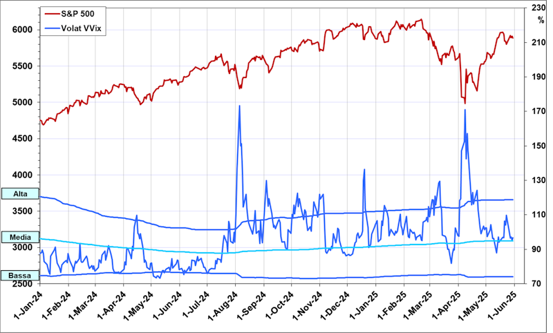 Recientemente, el VIX alcanzó un pico elevado el 8 de abril (ver flecha azul) con valores cercanos a 52 puntos – niveles no vistos desde marzo de 2020. Simultáneamente, el S&P 500 marcó un mínimo evidente (flecha roja) en torno a 4980 puntos. El detonante fue la amenaza de aranceles en EE.UU. Posteriormente, el VIX cayó a su mínimo el 16 de mayo (flecha verde) con ~17 puntos, coincidiendo con la recuperación del S&P 500 hasta hoy. Sin embargo, el VIX muestra ahora signos de nerviosismo cerca de su media histórica, sugiriendo que el S&P 500 está en una fase de agotamiento de su rebote.