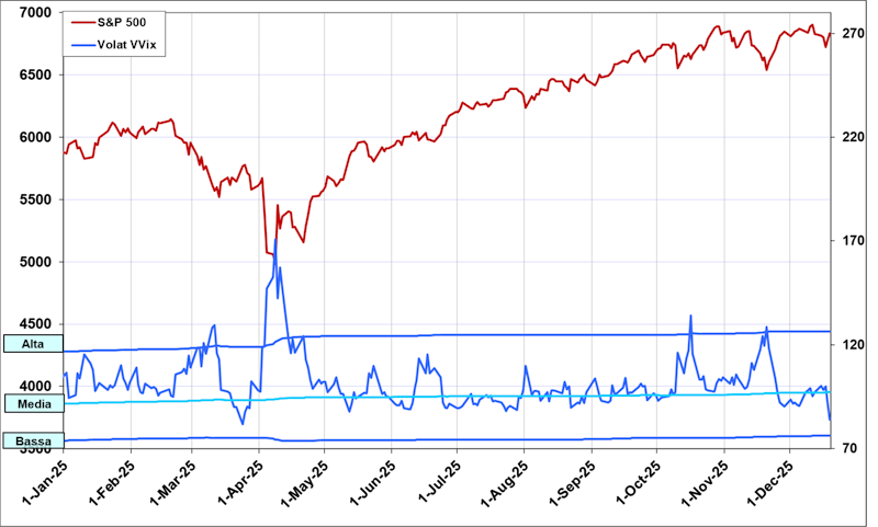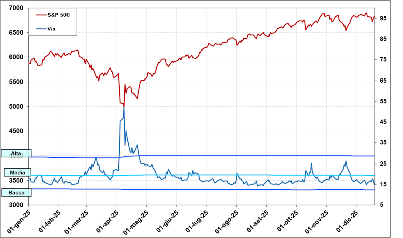 Este indicador tiene el comportamiento clásico contrario al del Índice S&P500 y, sobre todo, forma máximos muy pronunciados en correspondencia con los mínimos del mercado, como se puede deducir fácilmente del gráfico; por esto también se le llama «índice del miedo».