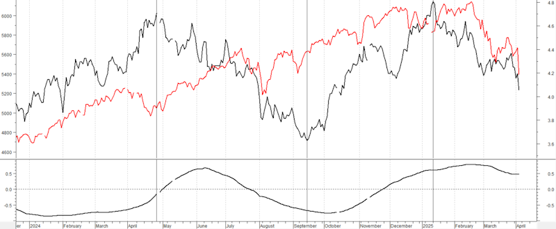Durante estas cuatro fases, el S&P 500 experimentó un crecimiento casi constante hasta su reciente pico del 19 de febrero (flecha roja). El gráfico de correlación confirma la ausencia de una relación consistente entre ambos mercados. Aunque la «correlación natural» debería ser inversa, desde el mínimo de rendimiento de septiembre de 2024, emerge una correlación directa : el rendimiento del T-Note y el S&P 500 están cayendo simultáneamente.