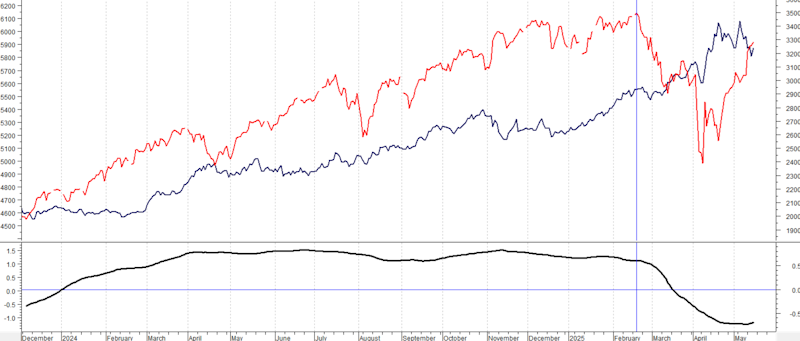 Como se aprecia, desde principios de 2024 hasta febrero de 2025 (línea vertical), la correlación fue notablemente positiva, con valores superiores a +0,5. En la fase posterior, esta correlación disminuyó y actualmente es marcadamente negativa. Durante este periodo, el S&P 500 registró un mínimo relevante el 8 de abril (flecha roja), mientras que el oro mantuvo fortaleza con un doble máximo histórico el 22 de abril y el 7 de mayo (flecha verde), alcanzando valores cercanos a los 3.500 $. Actualmente, el oro está en una leve corrección, mientras que el S&P 500 recupera fuerza.