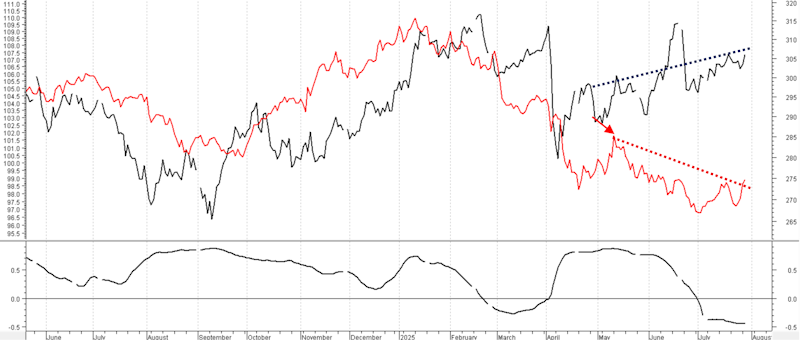 Empezamos con la evolución del Índice CRB (línea roja, escala derecha) y el Dollar Index (línea negra, escala izquierda), actualizados al cierre del 30 de julio.