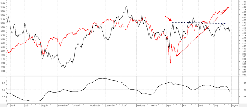 Analicemos ahora la correlación entre el S&P 500 (línea roja, escala izquierda) y los rendimientos del T-Note (línea negra, escala derecha), ambos en escalas verticales logarítmicas: