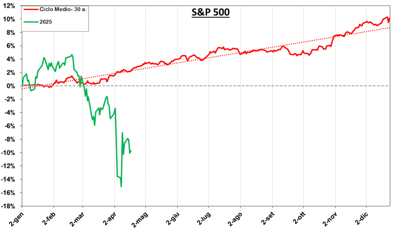 Abril históricamente registra una ganancia promedio del 1,9% en los últimos 30 años. Destaca que el 77% de los abriles anteriores cerraron en positivo, lo que subraya que la tendencia actual de 2025 está significativamente fuera de los parámetros históricos.