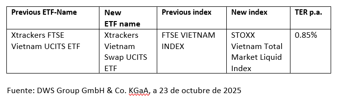 DWS ha cambiado el índice de referencia de su ETF Xtrackers Vietnam. El ETF ahora sigue el índice STOXX Vietnam Total Market Liquid.