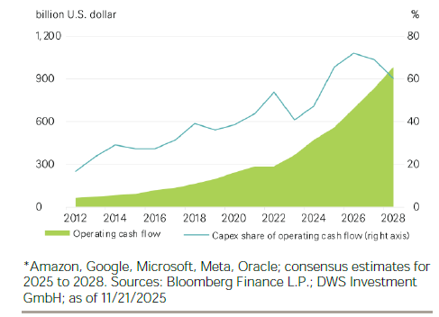 Hiperescaladores como Microsoft, Alphabet, Meta y Amazon han revisado repetidamente al alza sus planes de inversión en capital y pueden permitírselo, gracias a su sólida generación histórica de flujo de caja. Su gasto en capital como porcentaje del flujo de caja operativo sigue estando en rangos manejables. Sin embargo, estas inversiones están transformando a los gigantes tecnológicos de innovadores con pocos activos a proveedores de infraestructura intensiva en capital, lo que plantea importantes preguntas sobre cómo los valorarán los mercados en el futuro.