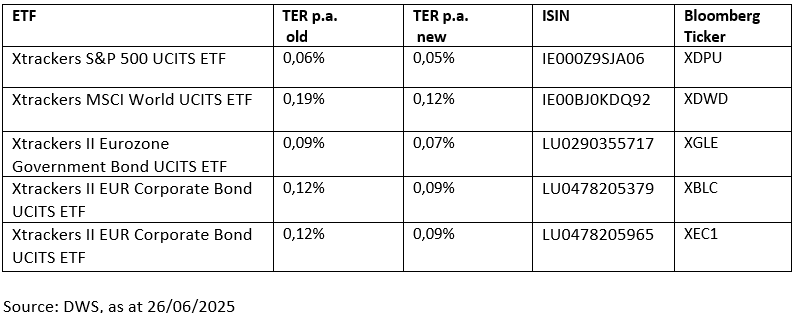 DWS reducirá, a partir del 1 de julio de 2025, las comisiones anuales fijas de cinco ETFs de la gama Xtrackers. Esta medida forma parte de una optimización continua de la oferta y del enfoque estratégico para responder a las cambiantes necesidades de los inversores.