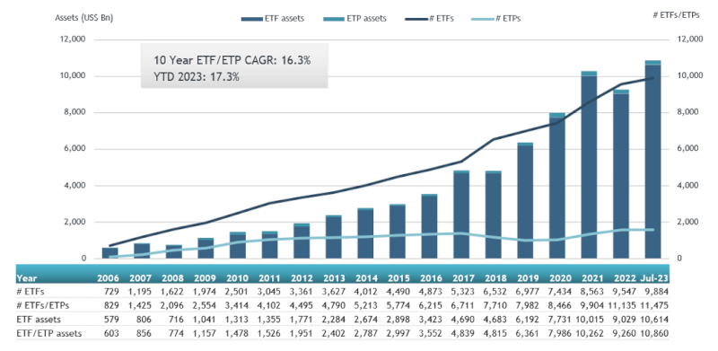 At the end of July 2023, the Global ETFs industry had 11,475 products, with 23,355 listings, assets of $10.86 trillion, from 696 providers listed on 81 exchanges in 63 countries.