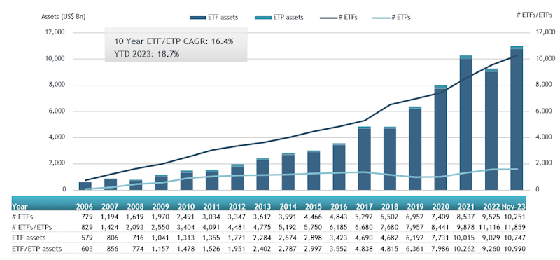 - Assets invested in the global ETFs industry reached a new milestone of $10.99 Tn at the end of November beating the previous record of $10.86 Tn at the end of July 2023.