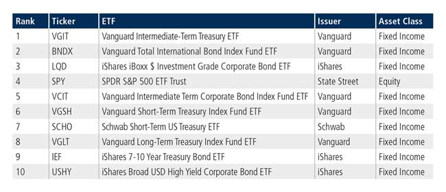 Nine of the top ten ETFs by traded notional volume were fixed income-based. The Vanguard Intermediate-Term Treasury ETF, which last appeared in the top ten in February last year, took first place.