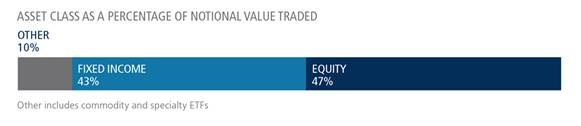 As a percentage of total notional value, equities accounted for 43% and fixed income for 47%, with the remainder comprising commodity and specialty ETFs.