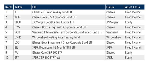 June’s top ten by traded notional volume mainly comprised fixed income products, with the iShares 7-10 Year Treasury Bond ETF ranked first. This is the third month the fund topped the list this year, after February and April.